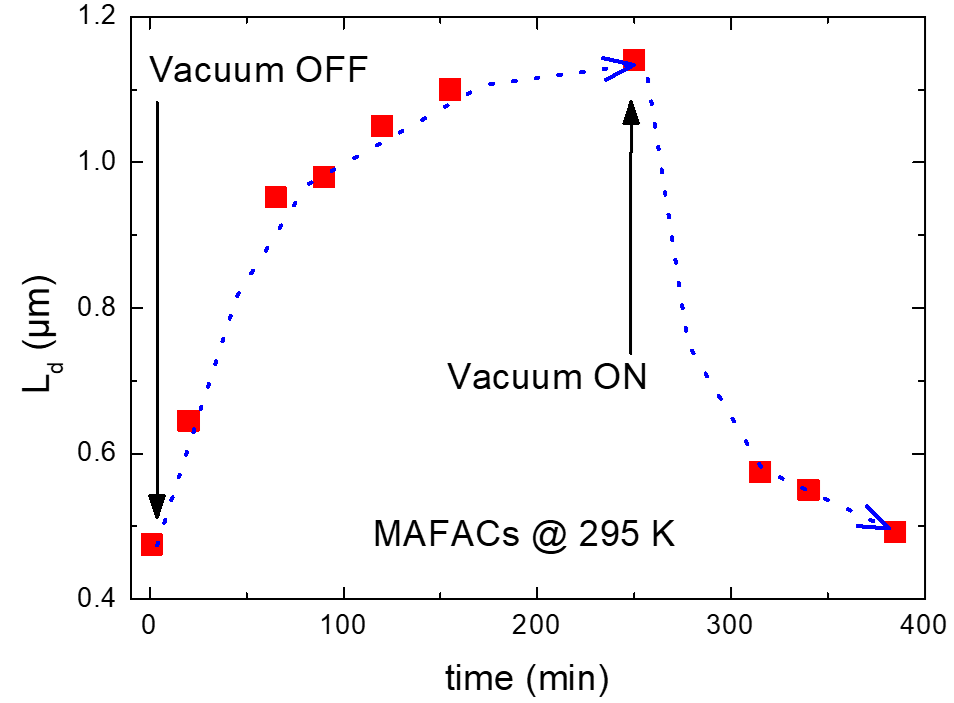 Evolutions de la longueur de diffusion d’un film mince de pérovkite triple-cation, MaFaCs, préparé à l’Institut Photovoltaïque d’Ile de France (IPVF, Palaiseau, France). A température ambiante et sous air, la longueur de diffusion augmente pour décroitre jusqu’à sa valeur d’origine lorsque l’échantillon est remis sous vide. |